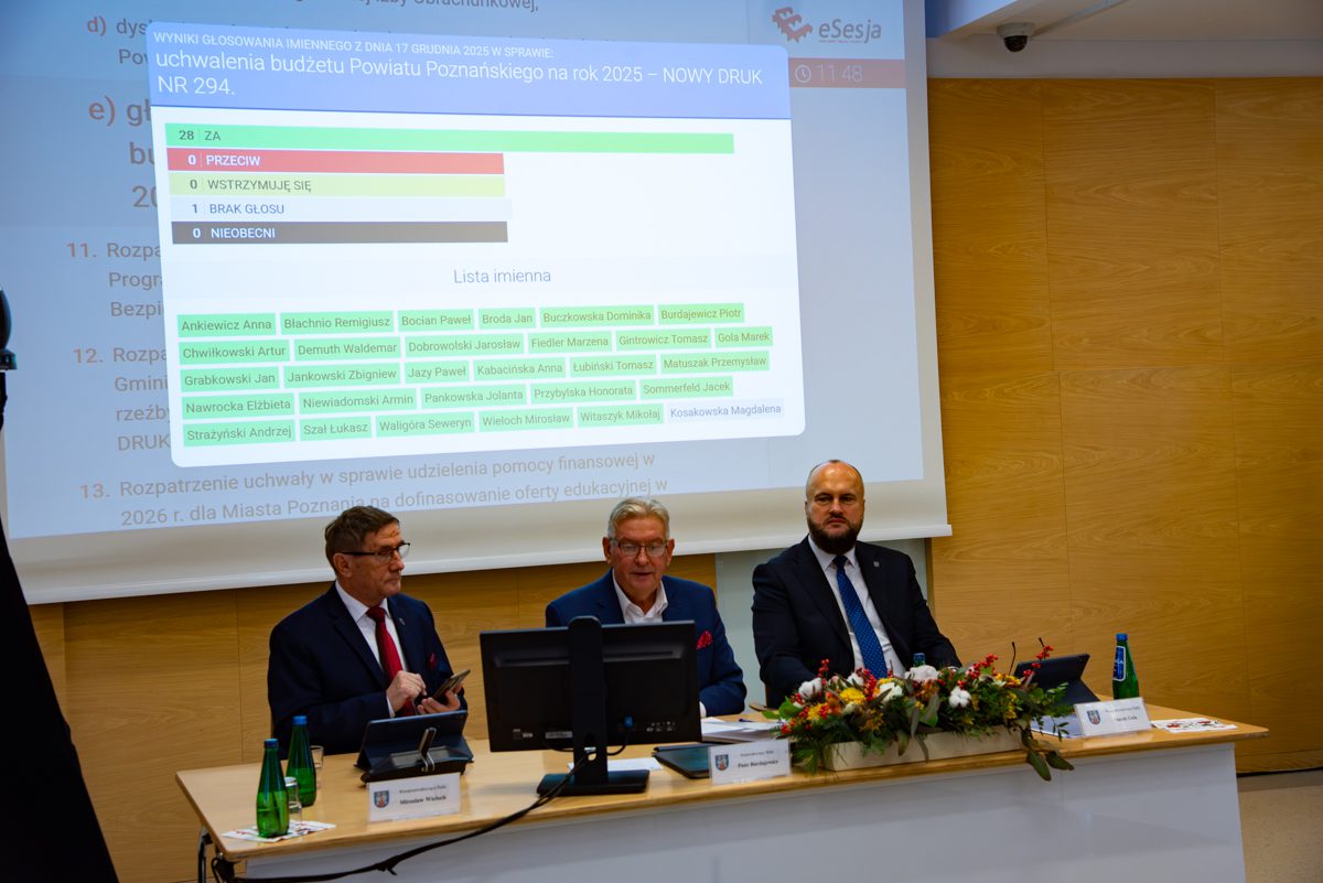 Prawie miliardowy plan finansowy z rekordową nadwyżką 69 mln zł. Tak wygląda budżet powiatu poznańskiego na 2026 rok. – Ten historyczny projekt pozwoli nam zrealizować kolejne odważne inwestycje, a jednocześnie zadba o to, co ważne dla mieszkańców na co dzień – mówi Jan Grabkowski, starosta poznański. Rada Powiatu przyjęła go jednogłośnie. Najwięcej pieniędzy trafi na oświatę, drogi oraz politykę społeczną. – To bezpieczny, proinwestycyjny i prospołeczny budżet. Doskonale przygotowany oraz bardzo ambitny – podkreślali radni nie tylko koalicji rządzącej, ale również klubu opozycyjnego Prawa i Sprawiedliwości.